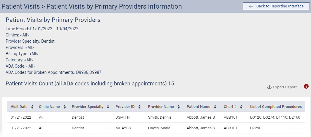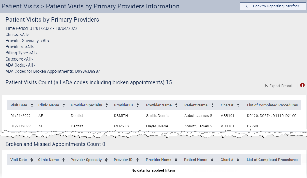 Click the name of the summary tile to open the Patient Visits by Primary Providers Information page and view details of each visit that is included in the calculation for the specified providers with the specified primary specialties. The Patient Visits by Primary Providers Information page also displays a count of broken/missed appointments and details of each broken/missed appointment. To return to the Resources page, click Back to Reporting Interface.