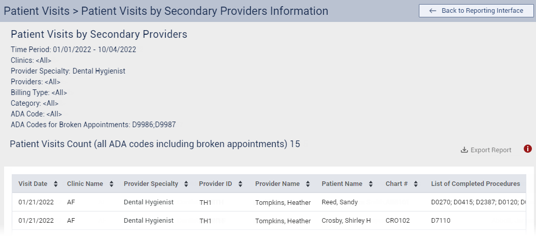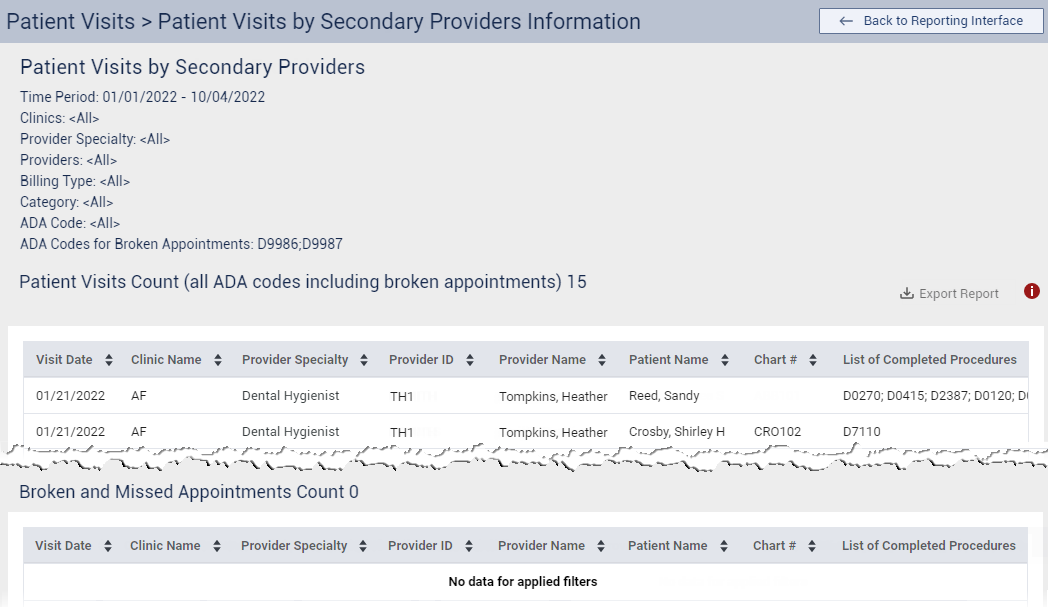 Click the name of the summary tile to open the Patient Visits by Secondary Providers Information page and view details of each visit that is included in the calculation for the specified providers with the specified secondary specialties. The Patient Visits by Secondary Providers Information page displays a count of broken/missed appointments and details of each broken/missed appointment. To return to the Resources page, click Back to Reporting Interface.