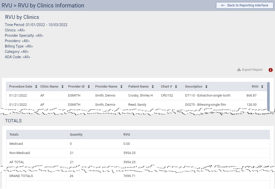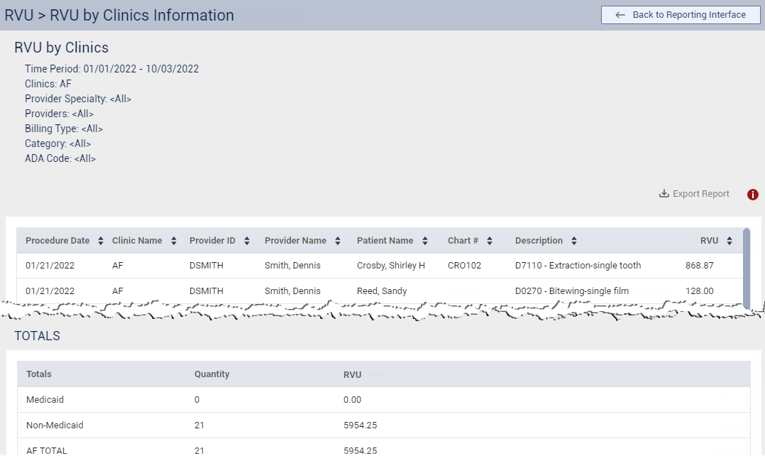 Click the name of the summary tile to open the RVU by Clinics Information page and view details of each procedure that is included in the calculation for the specified clinics. The RVU by Clinics Information page also displays the total RVU for each clinic. To return to the Resources page, click Back to Reporting Interface.