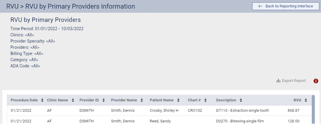 Click the name of the summary tile to open the RVU by Primary Providers Information page and view details of each procedure that is included in the calculation for the specified providers with the specified primary specialties. To return to the Resources page, click Back to Reporting Interface.