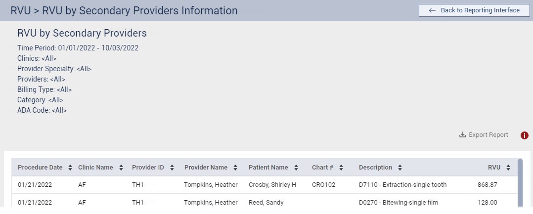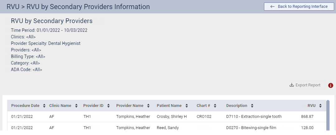 Click the name of the summary tile to open the RVU by Secondary Providers Information page and view details of each procedure that is included in the calculation for the specified providers with the specified secondary specialties. To return to the Resources page, click Back to Reporting Interface.