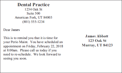 You can create reminder cards to send to patients with upcoming appointments. The "Continuing Care -- With Appt" letter merge creates reminder cards for patients who have a continuing care appointments scheduled.