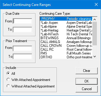 The Select Continuing Care Ranges dialog box appears.