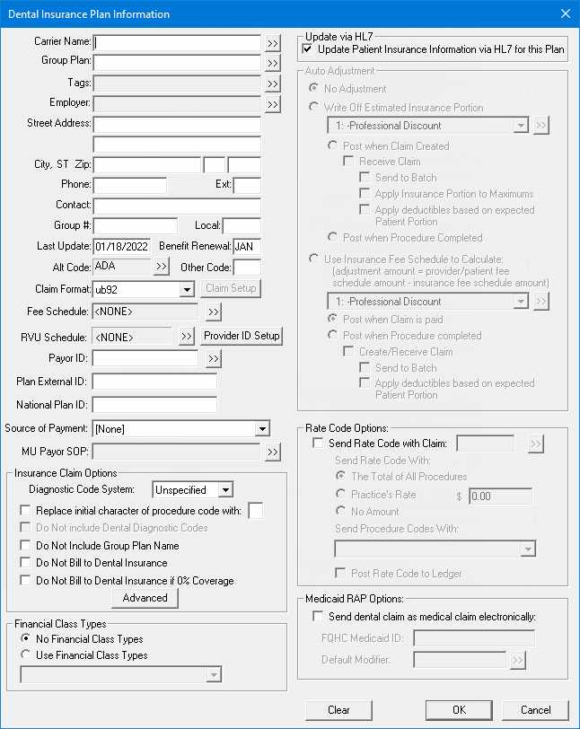 Update via HL7 - The state of the Update Patient Insurance Information via HL7 for this Plan checkbox determines if updates to the insurance plan are allowed through HL7.