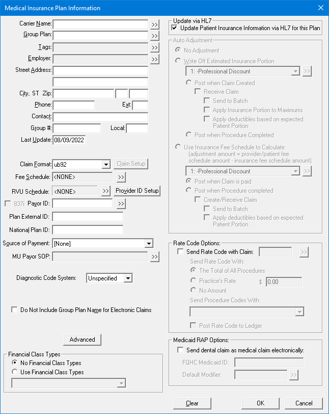 Update via HL7 - The state of the Update Patient Insurance Information via HL7 for this Plan checkbox determines if updates to the insurance plan are allowed through HL7.
