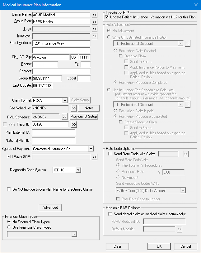 Update via HL7 - The state of the Update Patient Insurance Information via HL7 for this Plan checkbox determines if updates to the insurance plan are allowed through HL7.