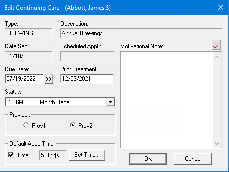 Default Appt. Time - The amount of time that this patient will need for appointments with this continuing care type attached. Do one of the following: