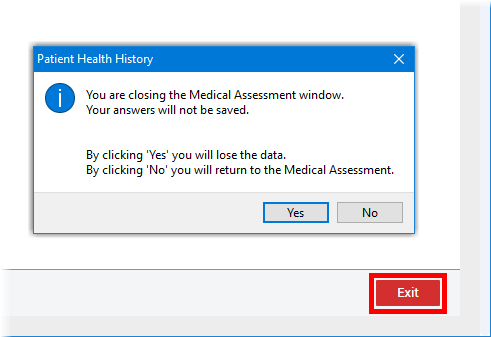 If you click Exit to close an assessment, and there are unsaved changes, a confirmation message appears and allows you to either exit without saving or return to the assessment.