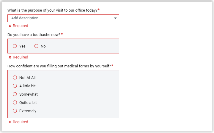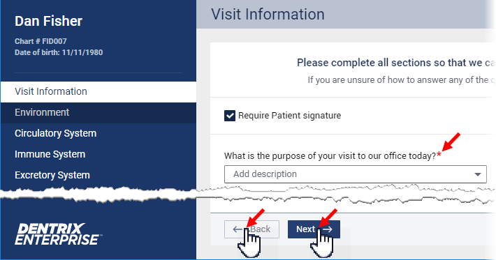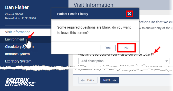 If you attempt to navigate to another section before answering all required questions in the section that you are currently viewing, Dentrix Enterprise helps you easily identify missing required information.