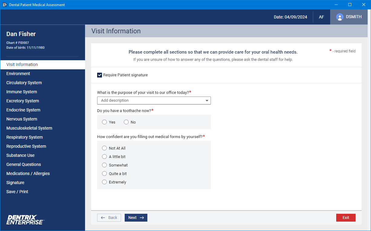In Dentrix Enterprise, you can record a patient’s medical history using an electronic form. The form consists of several sections that a provider goes through with the patient. All required questions on the form must be answered. Then, a provider or staff member and, if required, a patient or guardian must sign the form. Also, you can save a copy of the completed form as a .pdf file in a folder and/or in the patient’s Document Center record.