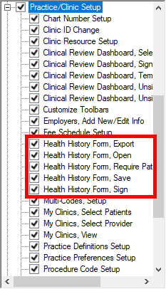 The "Health History Form, Open," "Health History Form, Sign", "Health History Form, Export," and "Health History Form, Save" security rights (in the "Practice/Clinic Setup" category) determine if a user can open, sign, export, and save assessments, respectively.