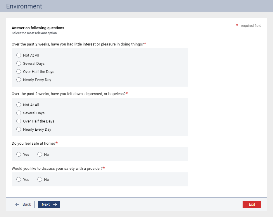 Over the past 2 weeks, have you had little interest or pleasure in doing things? – Select Not At All, Several Days, Over Half the Days, or Nearly Every Day.