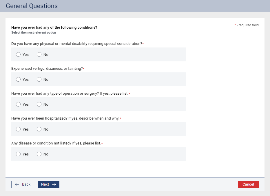 Do you have any physical or mental disability requiring special consideration? – Select Yes or No.