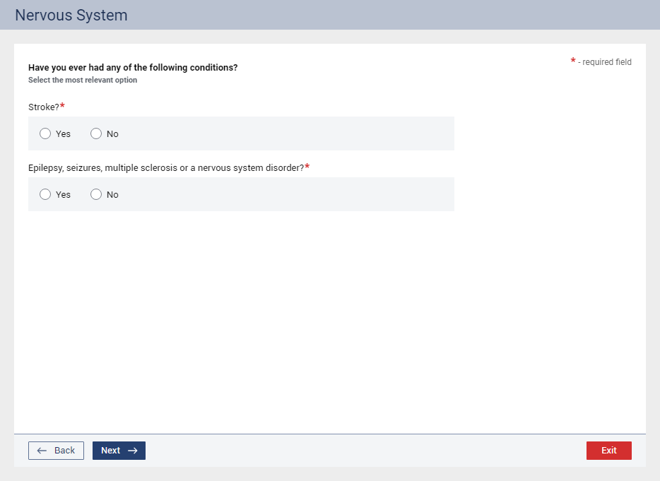 Epilepsy, seizures, multiple sclerosis or a nervous system disorder? – Select Yes or No.