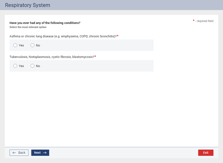 Asthma or chronic lung disease (e.g. emphysema, COPD, chronic bronchitis)? – Select Yes or No.