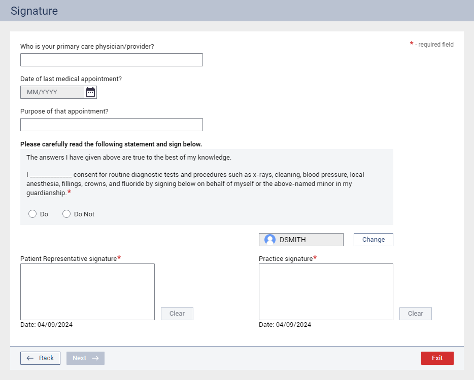 In the Practice signature box, a provider or staff member signs using a mouse.