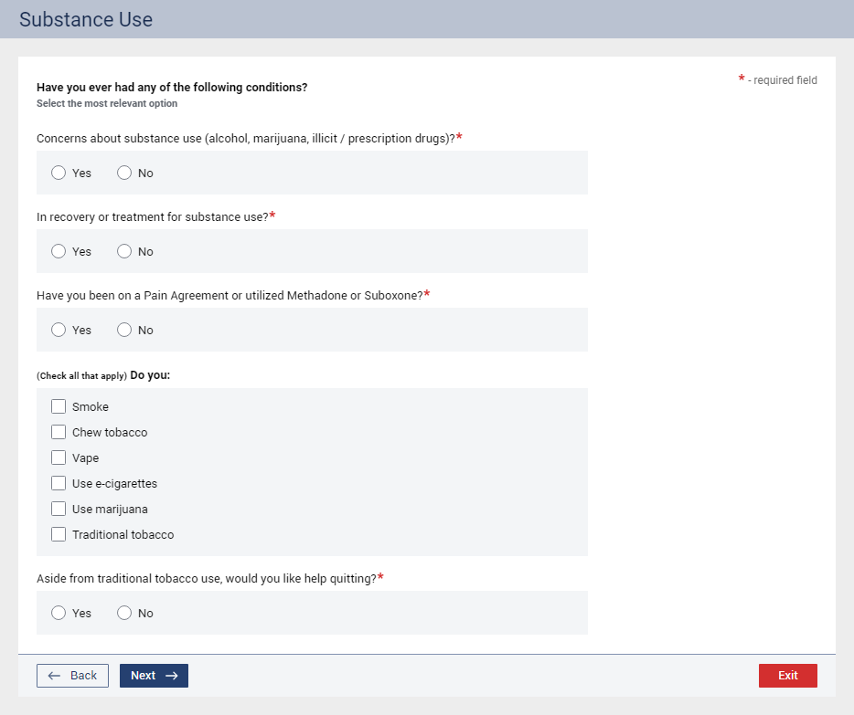 Have you been on a Pain Agreement or utilized Methadone or Suboxone? – Select Yes or No to specify if the patient has ever had an agreement or uses the medications mentioned.