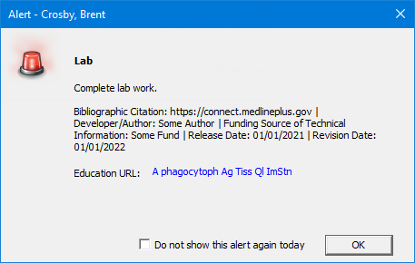 To suspend the alert for this patient for today only, select the Do not show this alert again today checkbox.