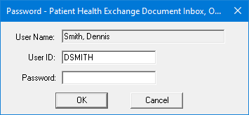 If your user account has been granted the "Patient Health Exchange Document Inbox, Open" security right, enter your credentials in the User ID and Password boxes, and then click OK.