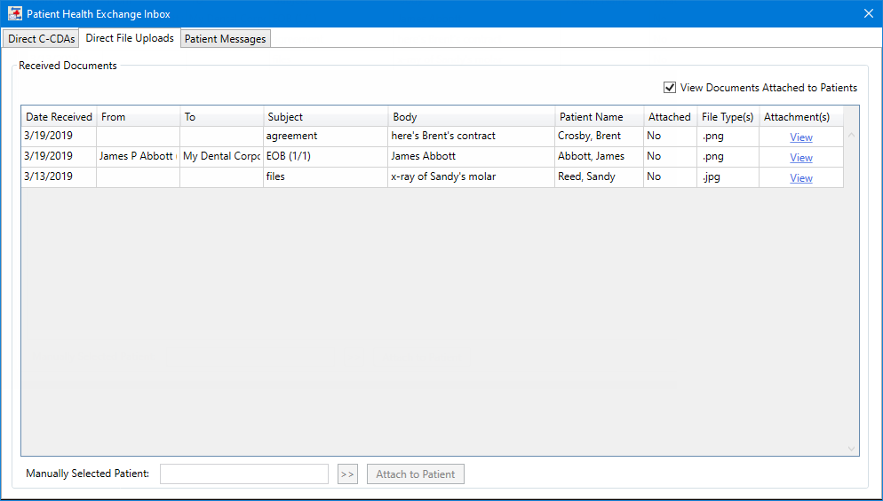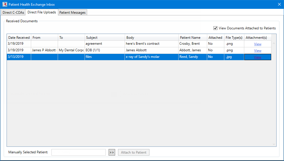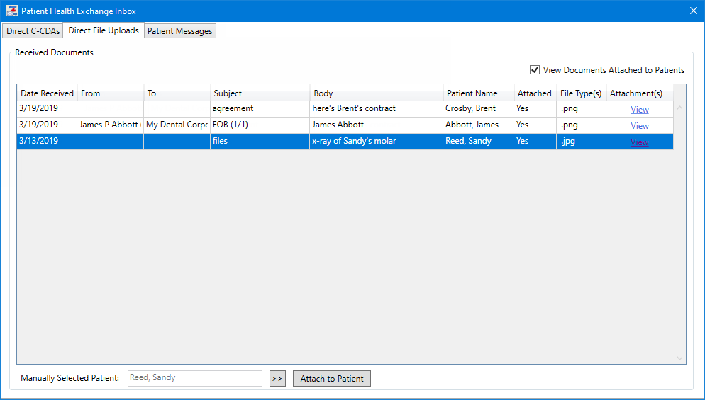 Note: To view messages with files that are already attached to the correct patients, select the View Documents Attached to Patients checkbox. Messages with files that are not attached to patients still appear in the Received Documents list.