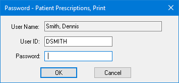 If your user account has been granted the "Patient Prescriptions, Print" security right, enter your credentials in the User ID and Password boxes, and then click OK.