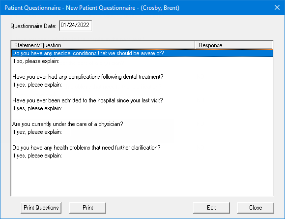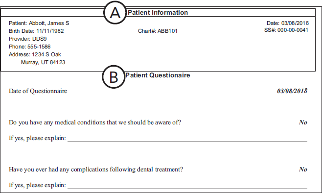Questions - Questions regarding medical/dental history and/or other custom questions, and the patient’s responses (if any).