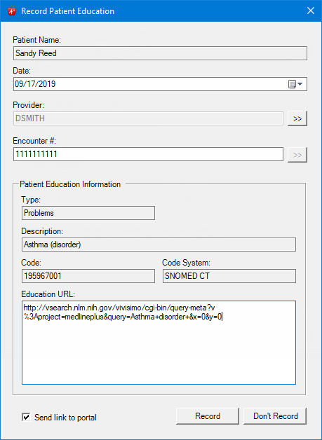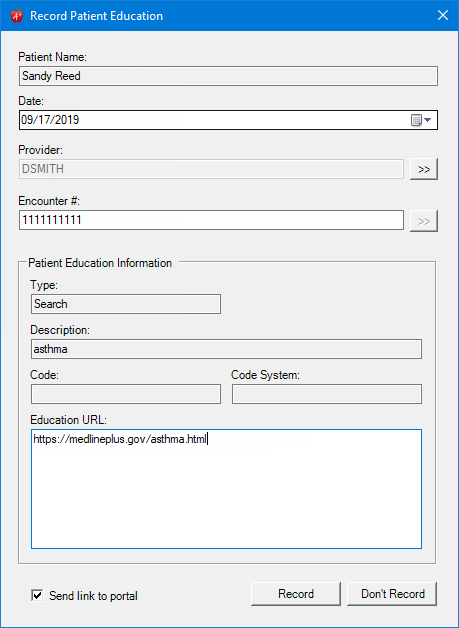 Either click Record to record that you provided the patient with education resources, or click Don't Record to not record an entry in the patient's education history.