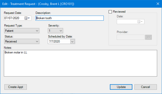 Note: If the treatment request has already been marked as having been reviewed, and you clear the Reviewed check box, the Status reverts to Received automatically unless the Status is Scheduled, in which case, the Status does not change.