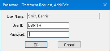 If your user account has been granted the "Treatment Request, Add/Edit" security right, enter your credentials in the User ID and Password boxes, and then click OK.