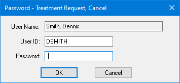 If the Password - Treatment Request, Add/Edit dialog box appears, user verification has been assigned to the "Treatment Request, Add/Edit" task. Do one of the following: