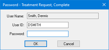 In the Password - Treatment Request, Complete dialog box, the overriding user enters his or her credentials in the User ID and Password boxes and then clicks OK.