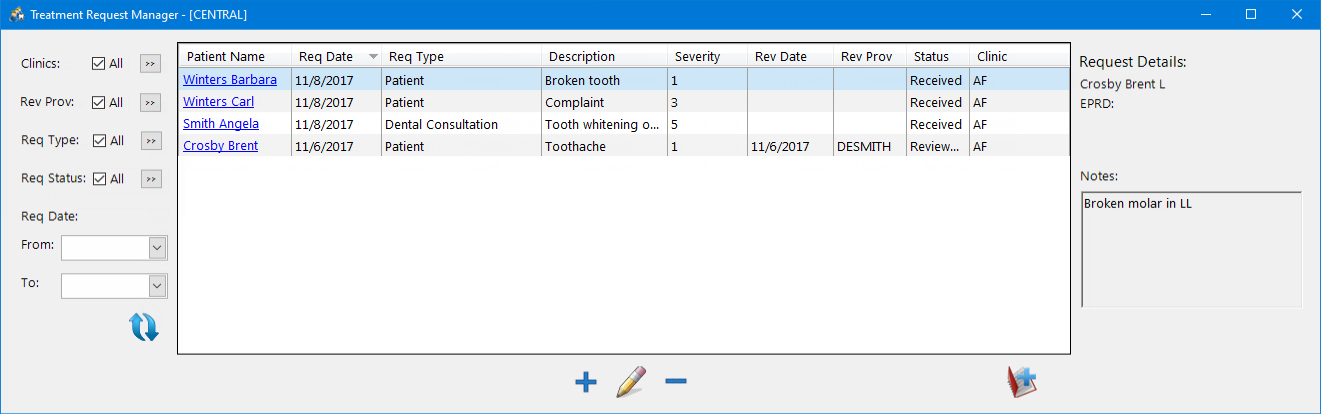 Note: Some details of the selected request, such as the patient name, appointment details, and notes, appear on the right side of the window. These details appear only if one request is selected.