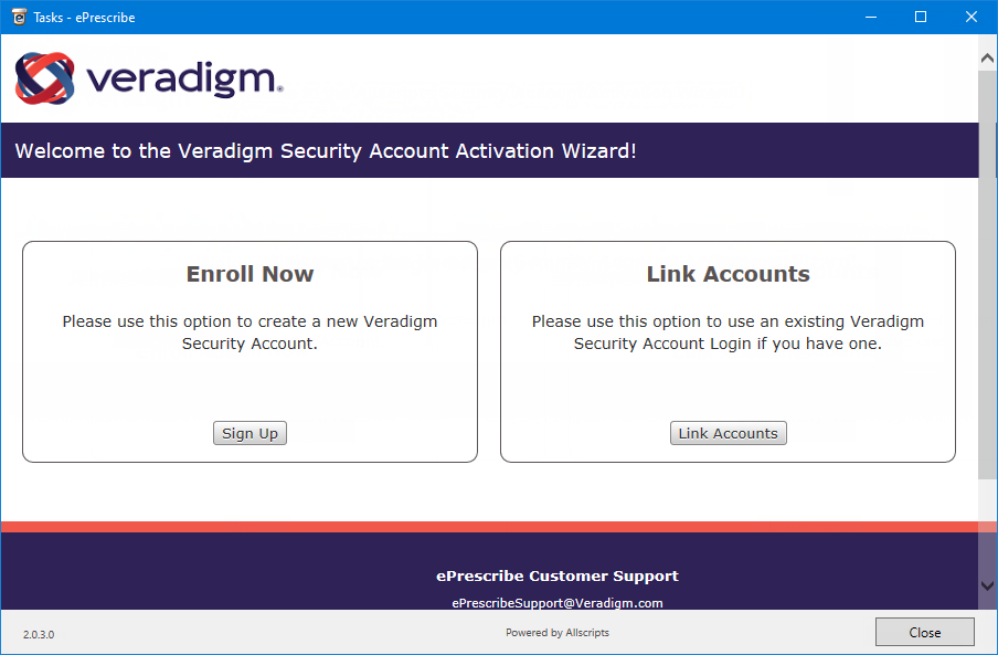 If you have not used ePrescribe yet, the Welcome to the Veradigm Security Account Activation Wizard! page appears.