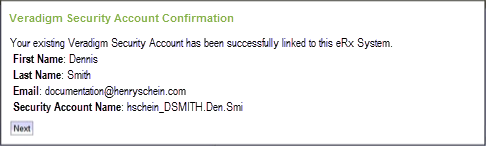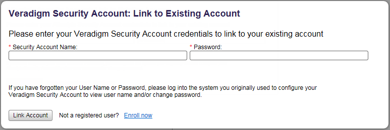 The Veradigm Security Account: Link to Existing Account page appears.