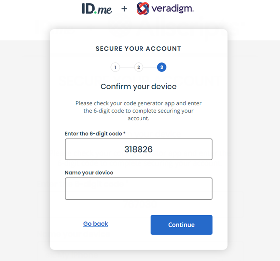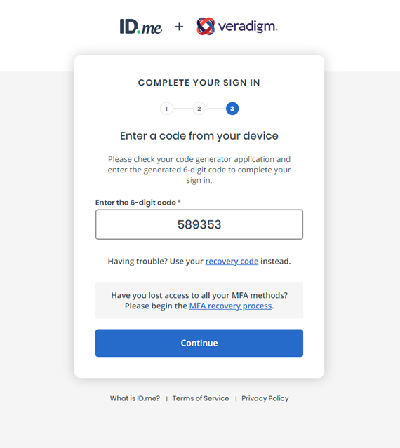 Confirm that the code in the Enter the 6-digit code box matches what appears in the ID.me Authenticator app on your smart device. If the codes do not match, enter the correct code.