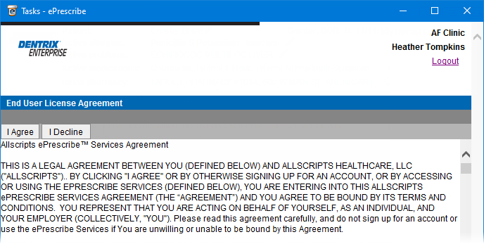If you are logged in as a non-prescriber (staff or prescribe-on-behalf user), the End User License Agreement page appears. Skip to step 19.
