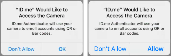 Tap OK or Allow to allow ID.me Authenticator to have access to your device's camera.