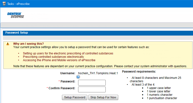 If you need to set up users to prescribe controlled substances electronically, or if you need to prescribe controlled substances electronically, enter a password in the Password and Confirm Password boxes, and then click Setup Password.