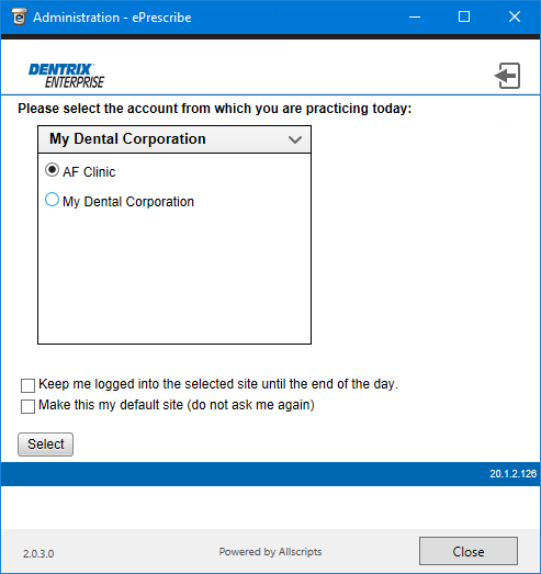 Note: With neither checkbox selected, ePrescribe will prompt you to select a site each time you open that module from Dentrix Enterprise.