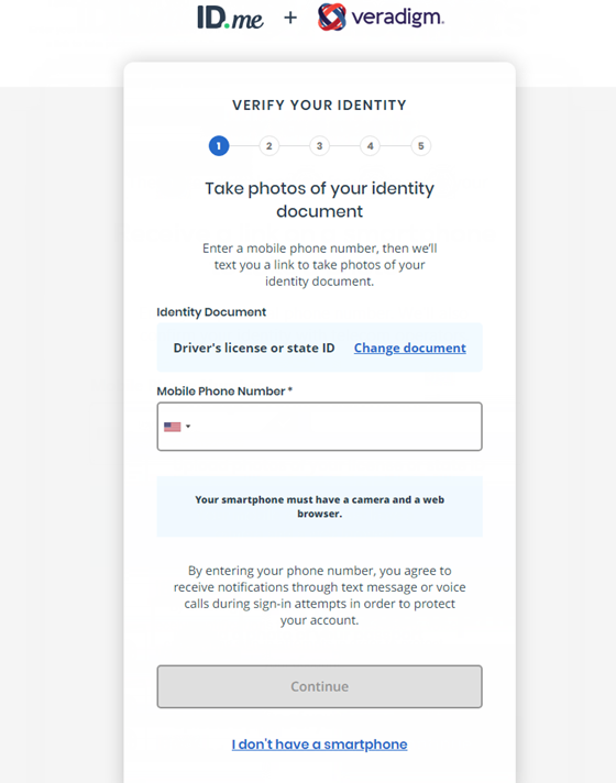 Make sure you have the ID.me Authenticator app installed on your smart phone or tablet and have the proper identification, and then click Continue.