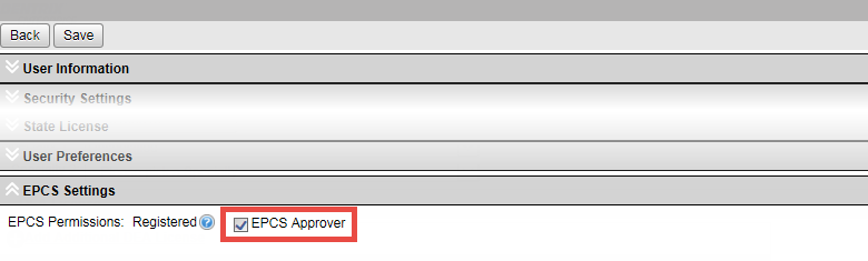 Scroll to the bottom. Under EPCS Settings, select the EPCS Approver checkbox.