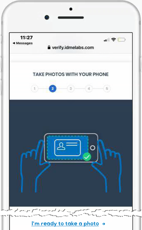 On you smart device, click the link in the text message that you receive from ID.me, and then take a photo of yourself using the device's camera.