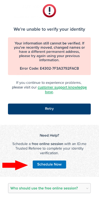 Important: If ID.me was not able to complete the identity proofing process, you will need to follow an alternate verification process, which involves completing a video conference with an ID.me representative (Trusted Referee) to confirm your identity.