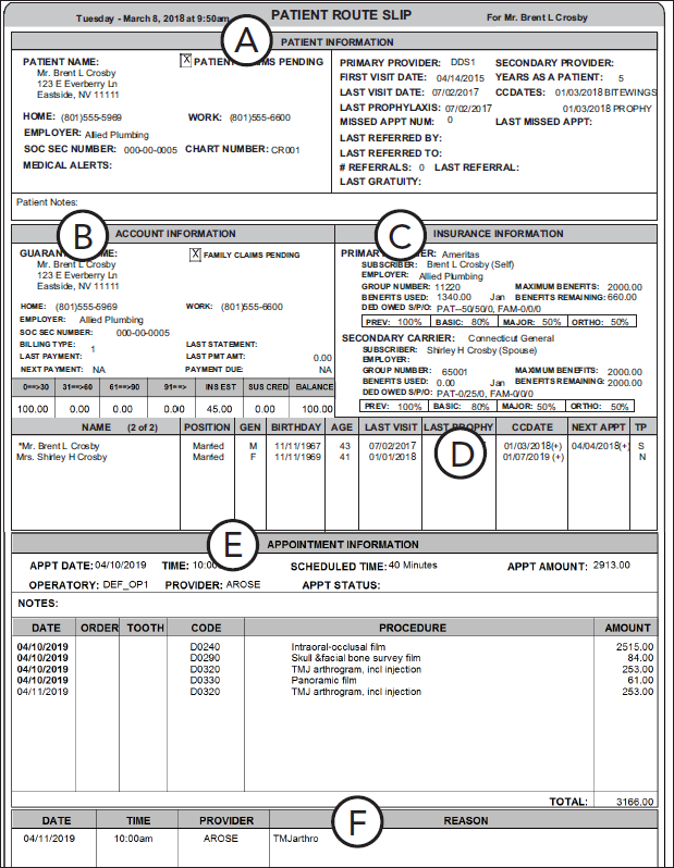 Patient Information - The patient’s contact information, employer, preferred provider(s), number of years as a patient, number of missed appointments, and referral information.