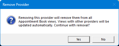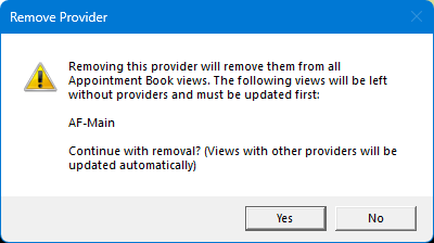 If all views (with the selected clinic assigned) will be left with other assigned providers, the message states that the provider will be removed from all views by removing the provider from the setup.