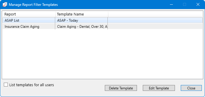 In the Manage Report Filter Templates dialog box, perform any of the following tasks as needed for templates that have been created: