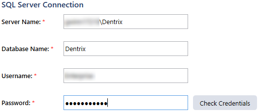 Server Name - The name or IP address of the database server. Also, if the SQL instance that houses your Dentrix Enterprise database has a name, after the IP address or name of the server, include a backslash (\) and then the instance name.