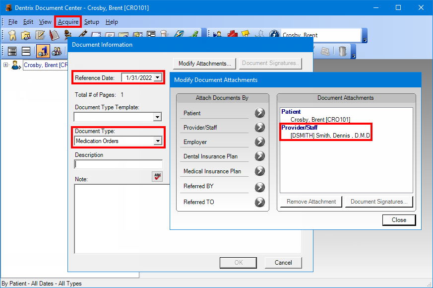 In Document Center, acquire a document with a Reference Date that is within the reporting period, Medication Orders selected as the Document Type, and an eligible provider as one of the Document Attachments.