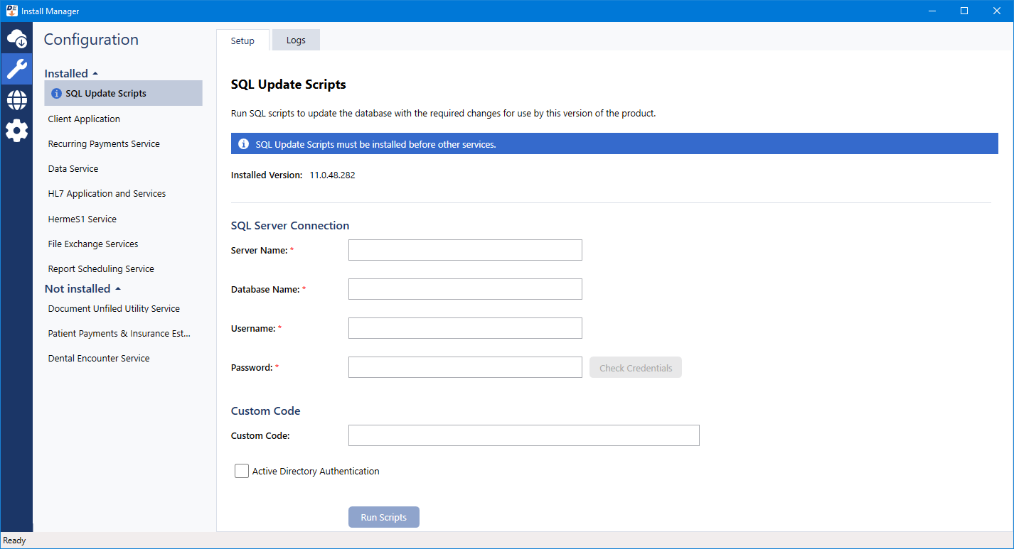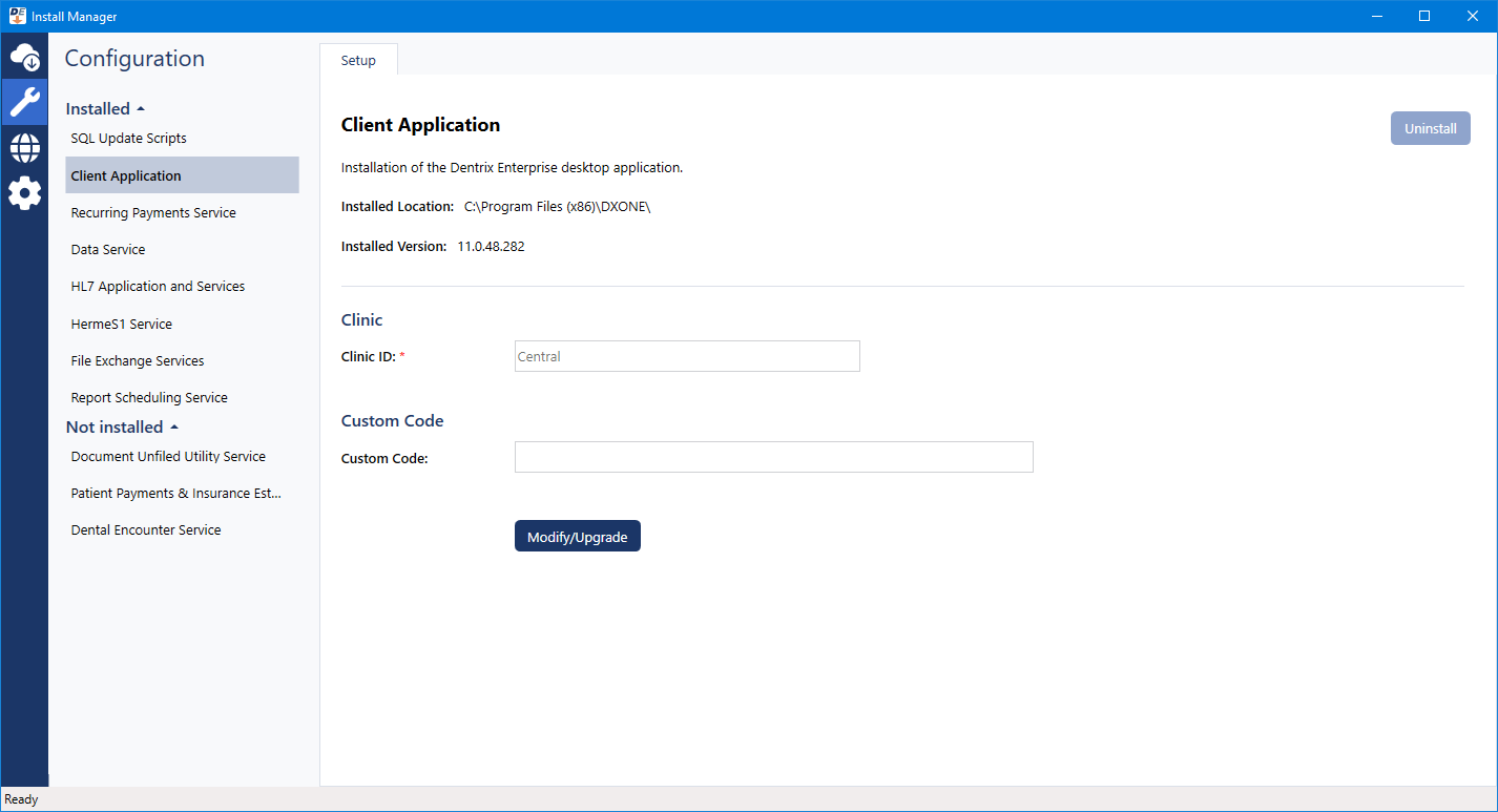 Install Manager now supports upgrading from 11.0.43 or later to 11.0.49, enabling or updating Active Directory authentication during the install or upgrade process, and modifying the installations of all Dentrix Enterprise components.
