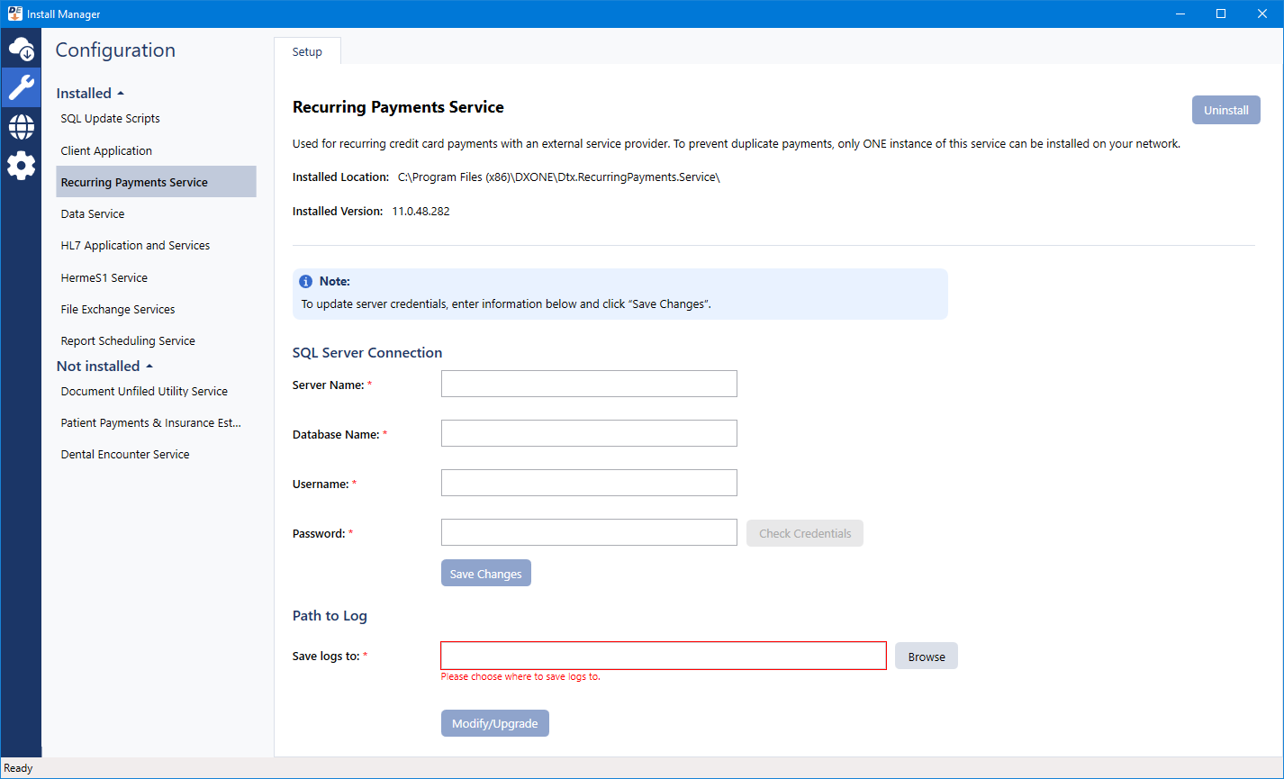 Recurring Payments Service - Enter the SQL Server Connection details. Select the folder where you want to Save logs to. Click Modify/Upgrade.